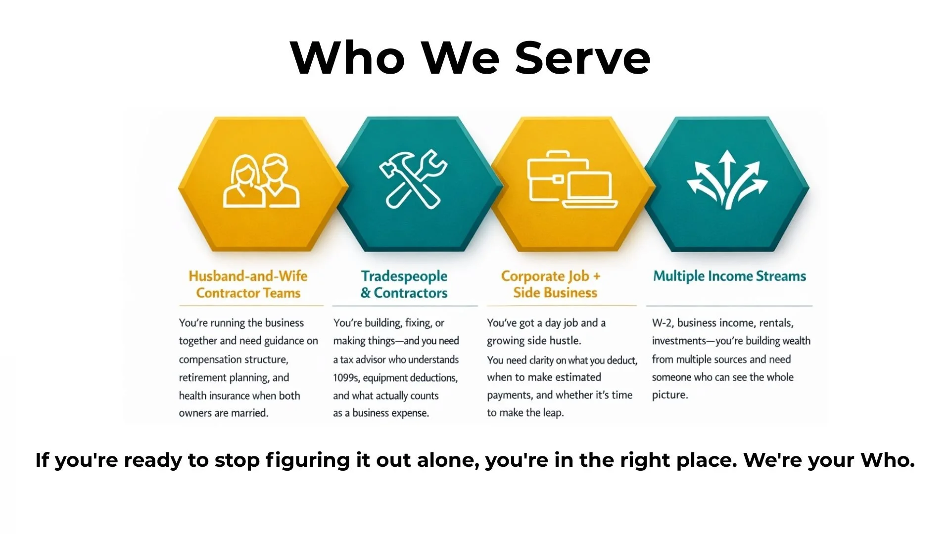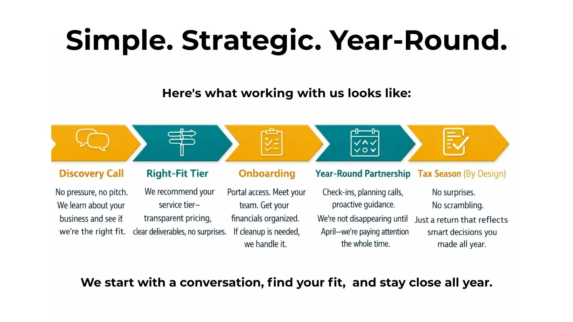 Whether you're a business owner tired of tax surprises, a self-employed professional managing multiple income streams, or an individual with complex finances—we're here to help you build clarity and confidence all year long.